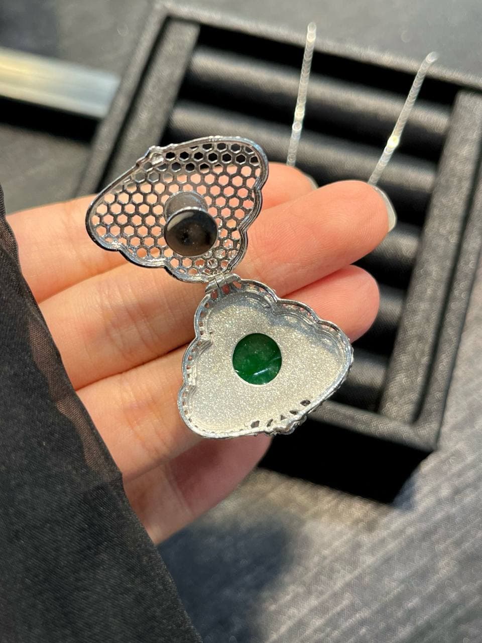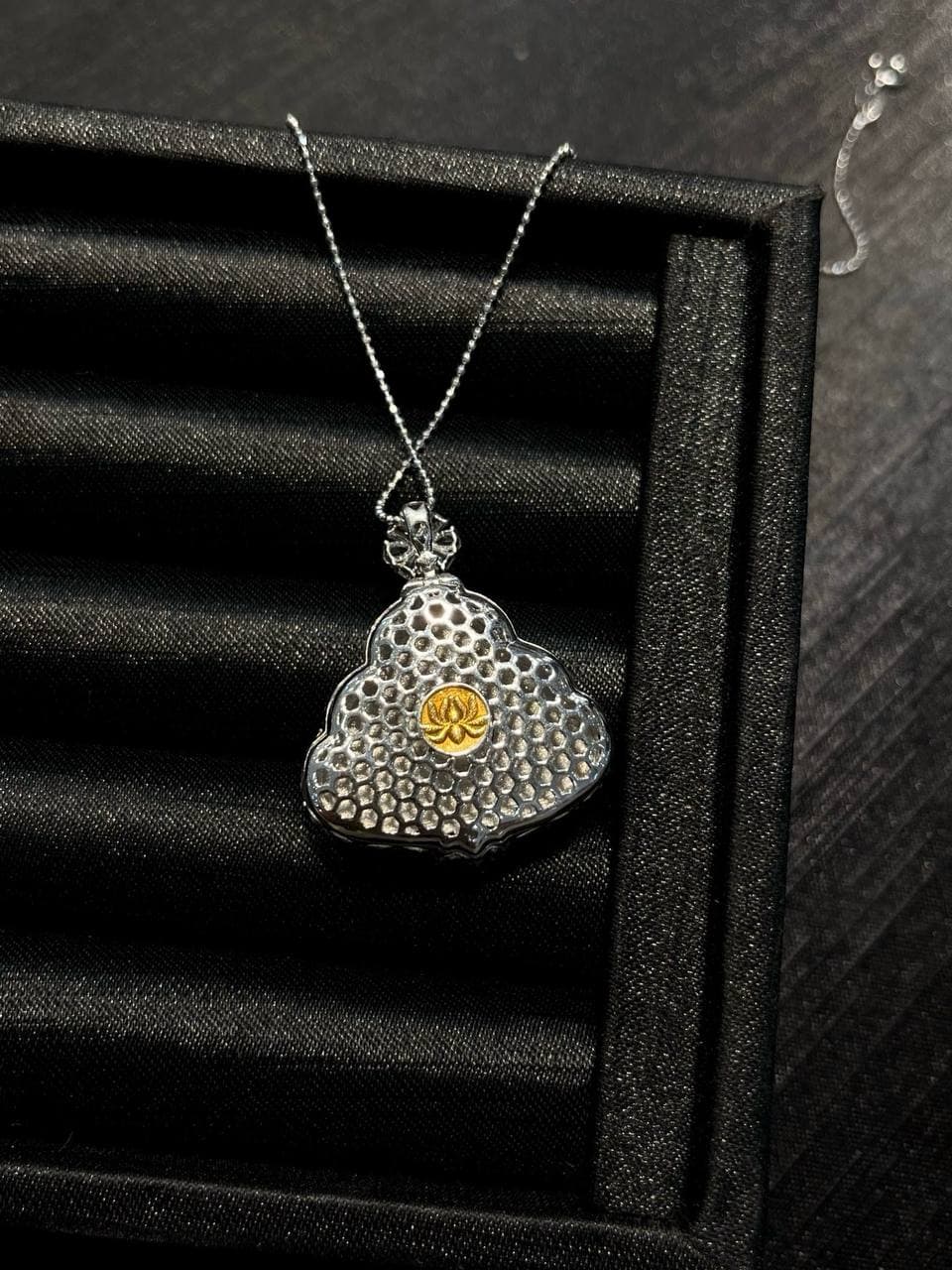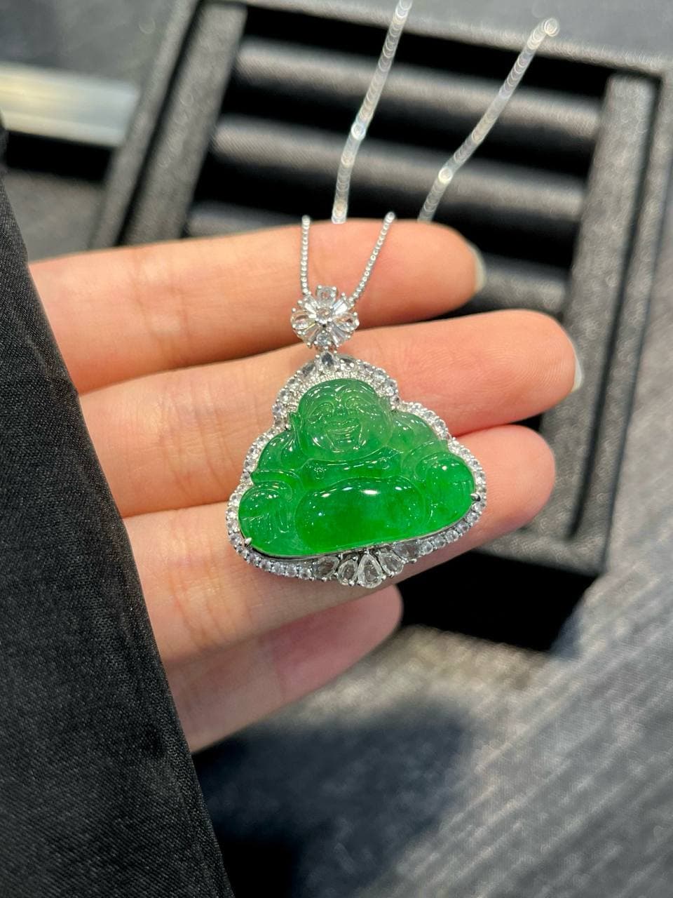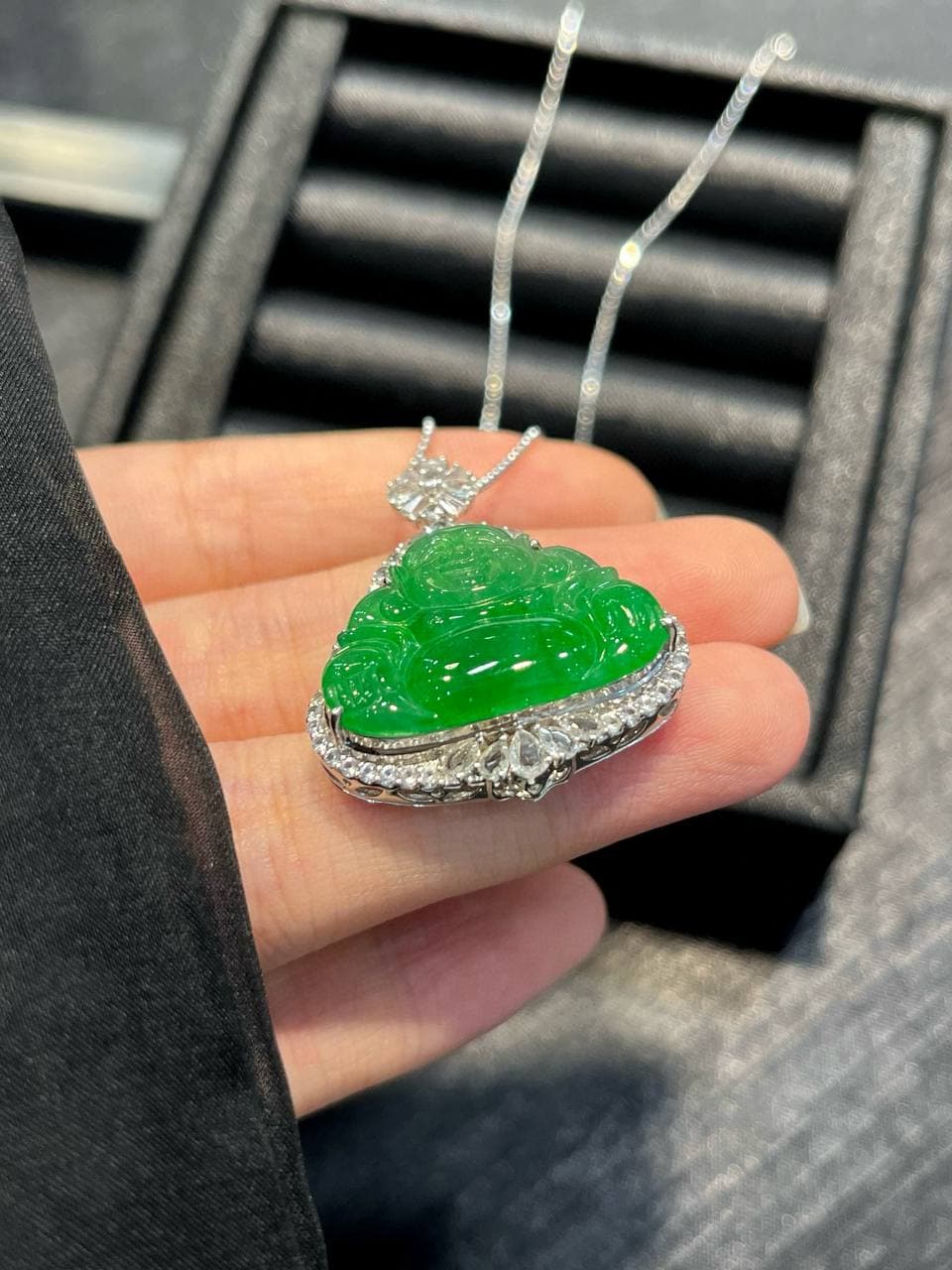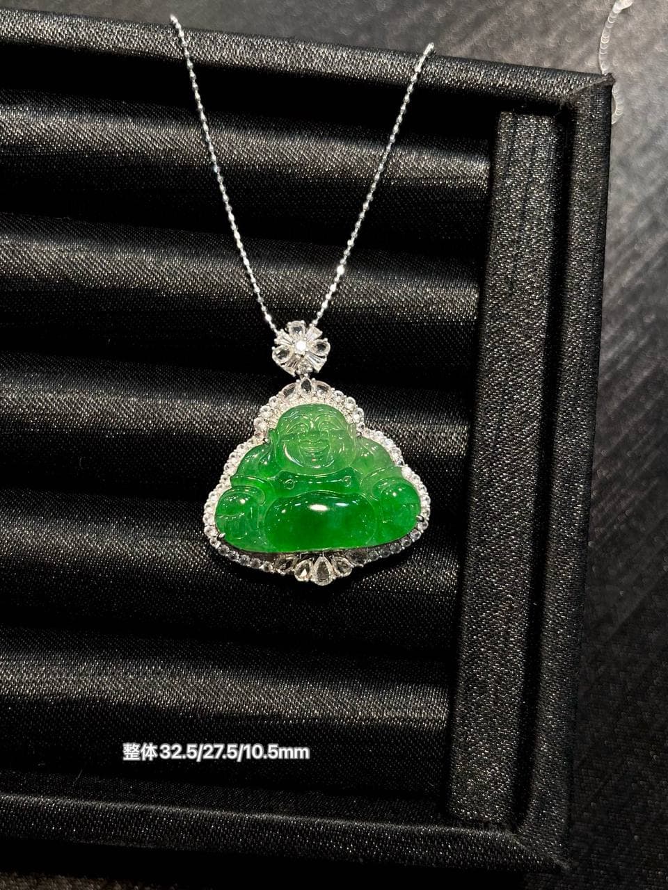 这款项链可能是结合了翡翠材质和佛公造型的设计,既展现了翡翠的美丽,又寄托了人们对好运和幸福的追求。这样的珠宝既有艺术价值,又有文化意义。